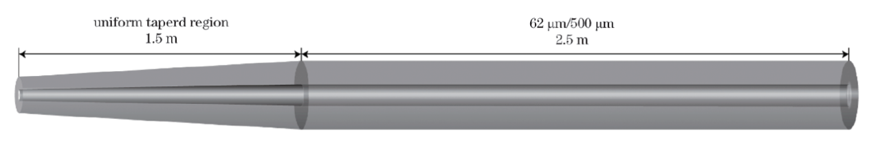 目前,脈沖光纖激光器輸出功率的提升主要受限于放大自發輻射引起的寄生振蕩和高峰值功率引起的受激拉曼散射(SRS),采用大模場面積摻鐿光纖可以有效抑制SRS效應,實現較高的功率與單脈沖能量,但較大的纖芯直徑可以傳輸較多的高階模式,導致光束質量退化。國外已報道采用短錐實現了高峰值功率和高光束質量的脈沖激光輸出,但采用空間光路耦合,光路結構復雜且短錐制備比較困難。此外,自由空間結構或多路全光纖合束技術也是實現千瓦級納秒脈沖激光的有效方法,其輸出性能受限于單纖納秒脈沖激光性能。因此,提升單纖納秒脈沖激光輸出性能,抑制SRS效應和光束質量退化,研究用于高功率脈沖激光放大器的大芯徑錐形摻鐿光纖,同時實現高平均功率、高單脈沖能量、高光束質量的脈沖激光輸出具有重要意義。