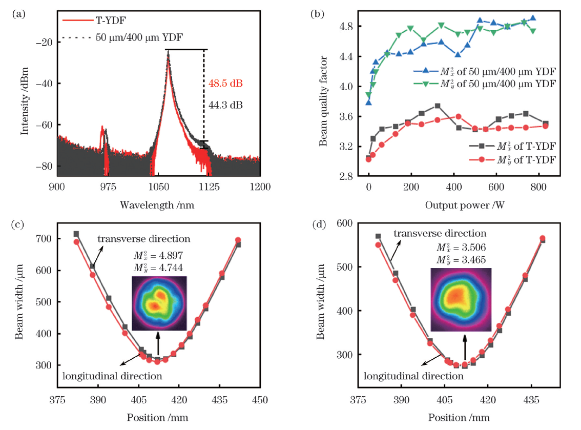 圖2 T-YDF與50/400 μm YDF輸出特性的對比。(a)最大輸出功率下的光譜;(b)不同輸出功率下的光束質量因子;(c)50/400 μm YDF在最大輸出功率下的光束質量因子;(d)T-YDF在最大輸出功率下的光束質量因子